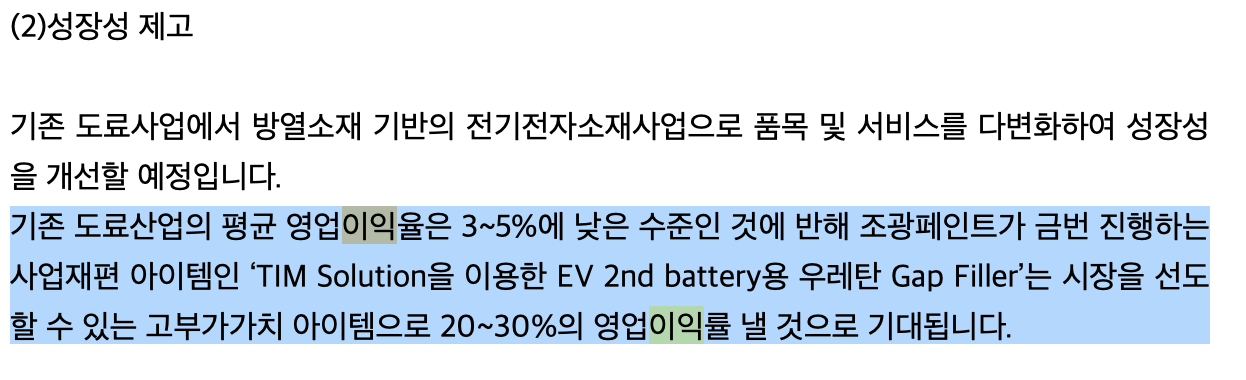 TIM Solution이라고 불리는 기술을 통해 우레탄, 에폭시, 실리콘소재를 기반으로 2차전지의 열관리에 도움을 주는 방열접착제를 생산/납품할 계획을 가지고 있습니다. 이는 사업보고서, 분기보고서를 통해서 구체화되어 설명되고 있습니다.