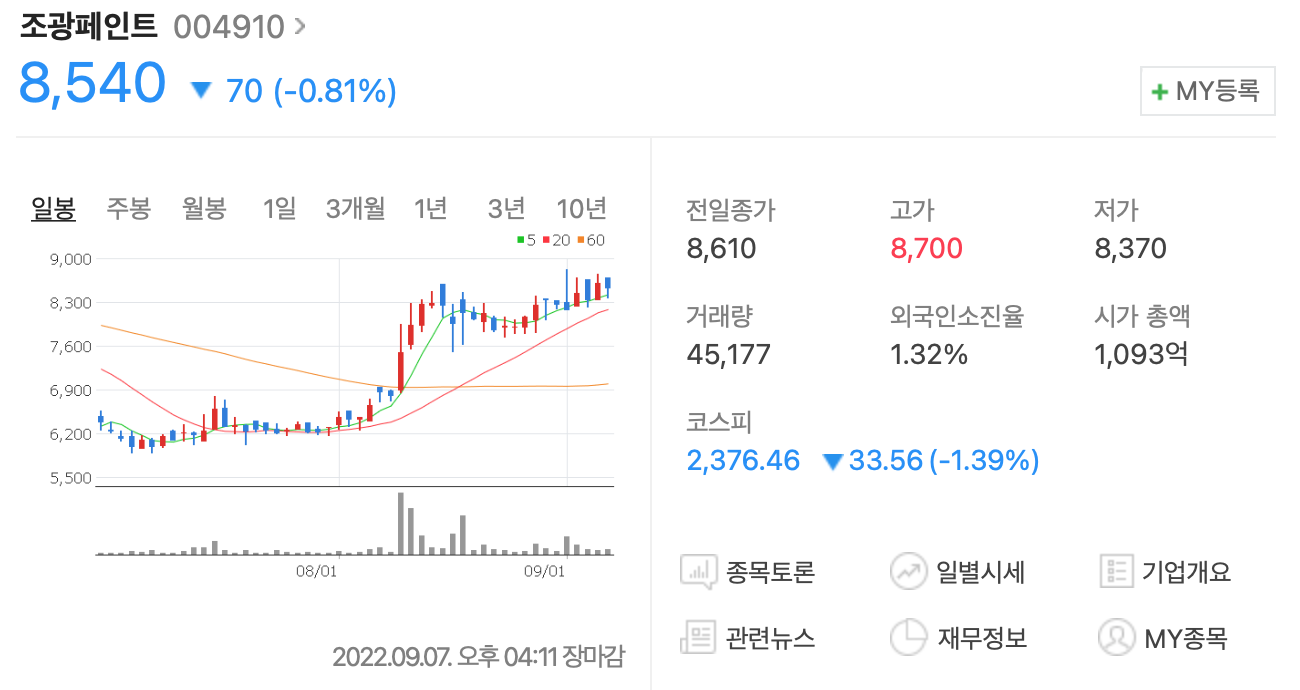 오늘 소개해드릴 종목은 [조광페인트]입니다.