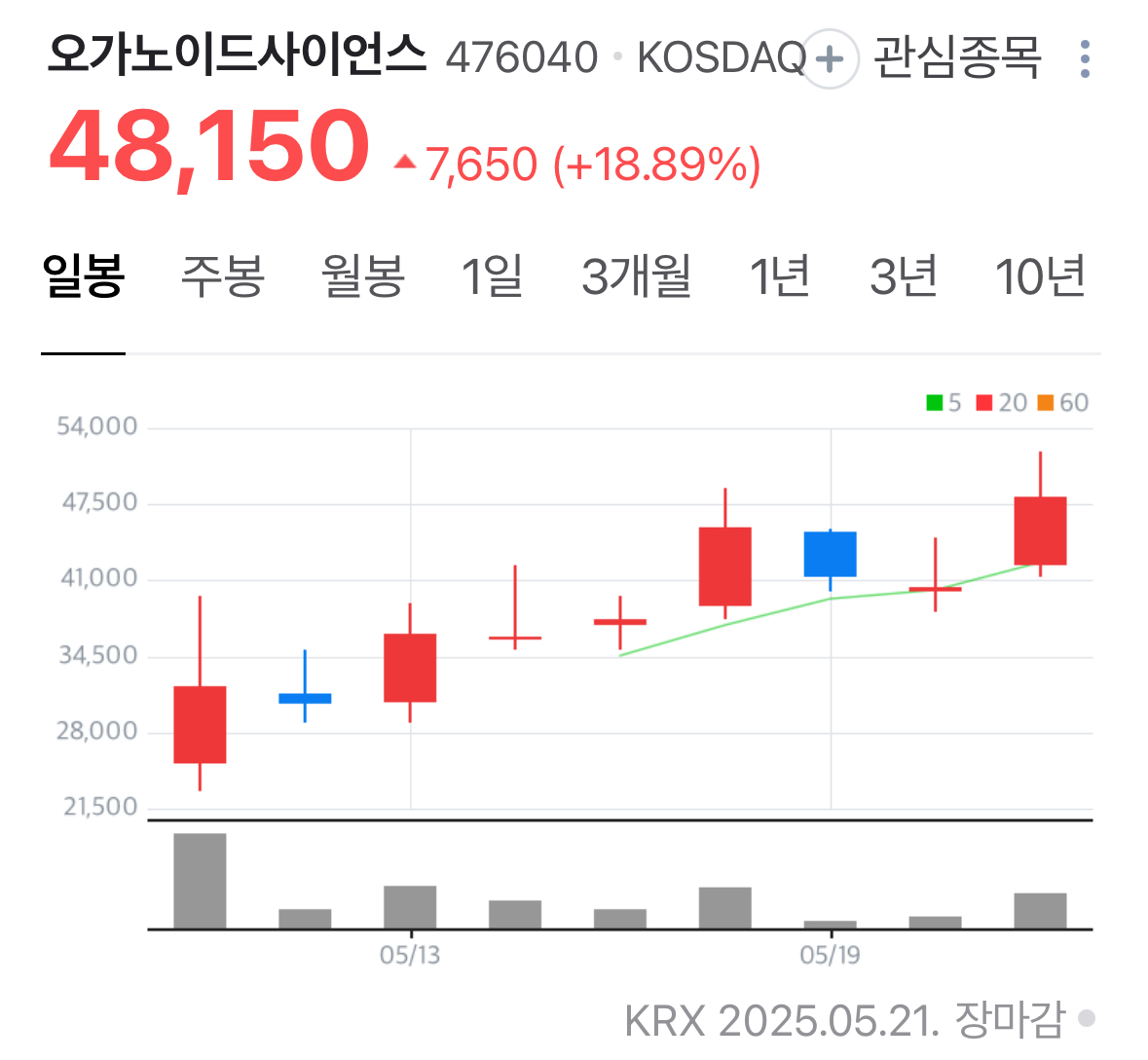2025년 5월 21일 기준, 오가노이드사이언스는 **52주 신고가(52,000원)**를 경신하며 시장의 중심으로 떠올랐습니다. 그 이유를 다섯 가지 키워드로 정리해보겠습니다.