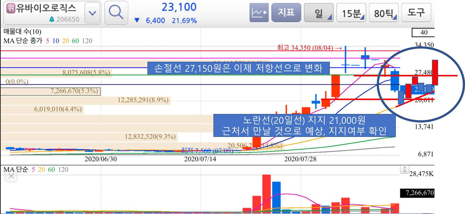 오늘, 유바이오로직스는 철저하게 흘러버렸고, 어제 손절가로 제시했던 27,150원을 훌쩍 뚫어버린 23,100원 (-21.7%)로 마감했습니다.