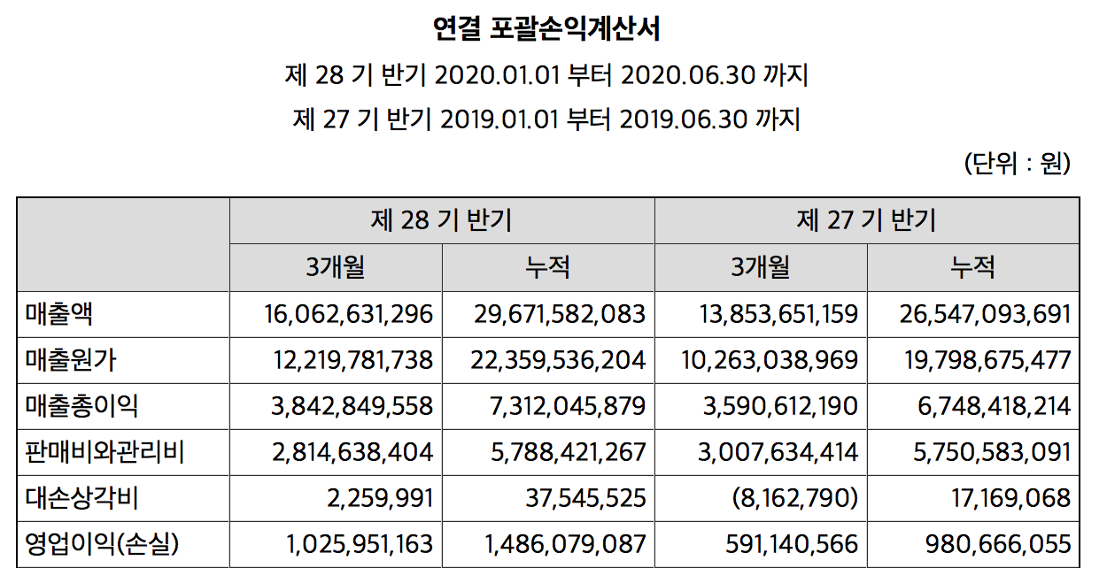 역시 반기 실적이 매출액과 영업이익 모두 늘어났습니다. 코로나 19에도 수혜받는 업종은 항상 잘 봐두어야합니다.