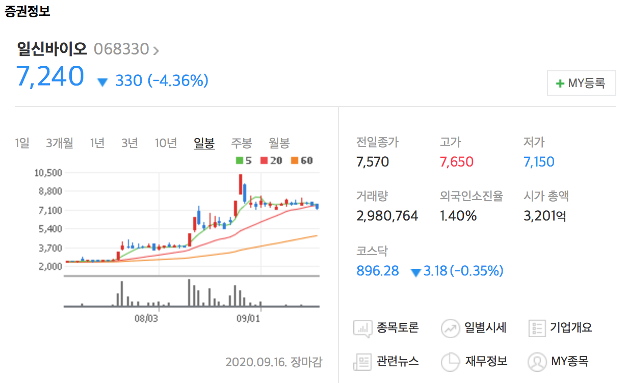 일신바이오의 주가는 몇번의 슈팅을 걸 기존 2,000원대 가격에서 3.5배가 넘는 가격이 되었습니다.