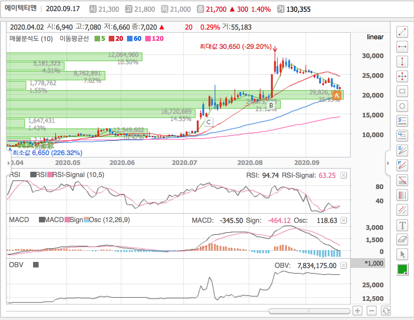 대장주 에이텍입니다. 7/16에 윗꼬리를 딴 이후에 며칠 뒤 상승했지만 현재 고점대비 -30% 상황입니다.
