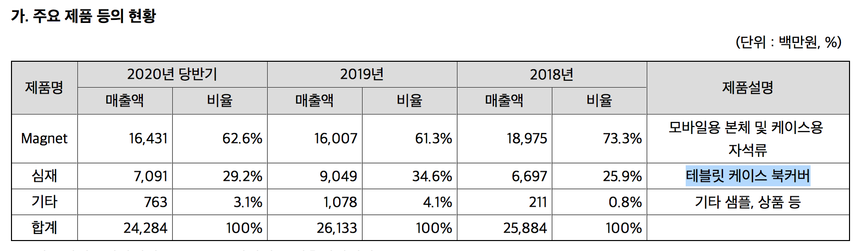 연간 실적으로 보면 기기 내부에 들어가는 차폐용 자석류인 마그넷 부문은 반기동안 전년 매출을 채웠고