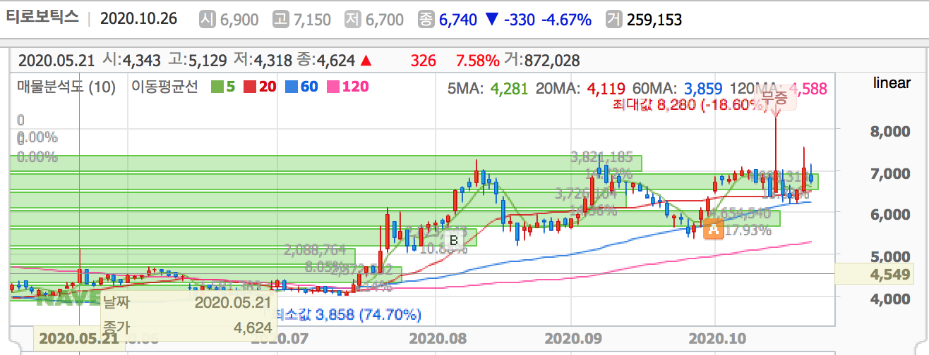 티로보틱스는 5월 21일에는 큰 주목을 받지 못했으나 최근들어 무상증자로 시세가 있었고, 차트적으로 하단을 높여가면서 시세를 뿜고 있는 종목입니다. 매력은 상단에 매물대가 없어서 급등을 할 수 있는 종목이고 상승 모멘텀을 계속 가지고 있기 때문에