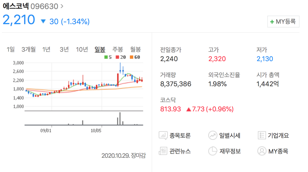 에스코넥은 최근 10월 15일 수소테마에서 상한가를 기록,