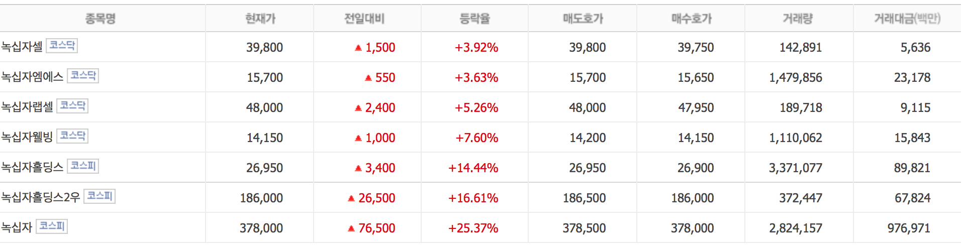하지만 금일 녹십자는 25% 상승, 녹십자홀딩스는 15%상승에 그쳤습니다.