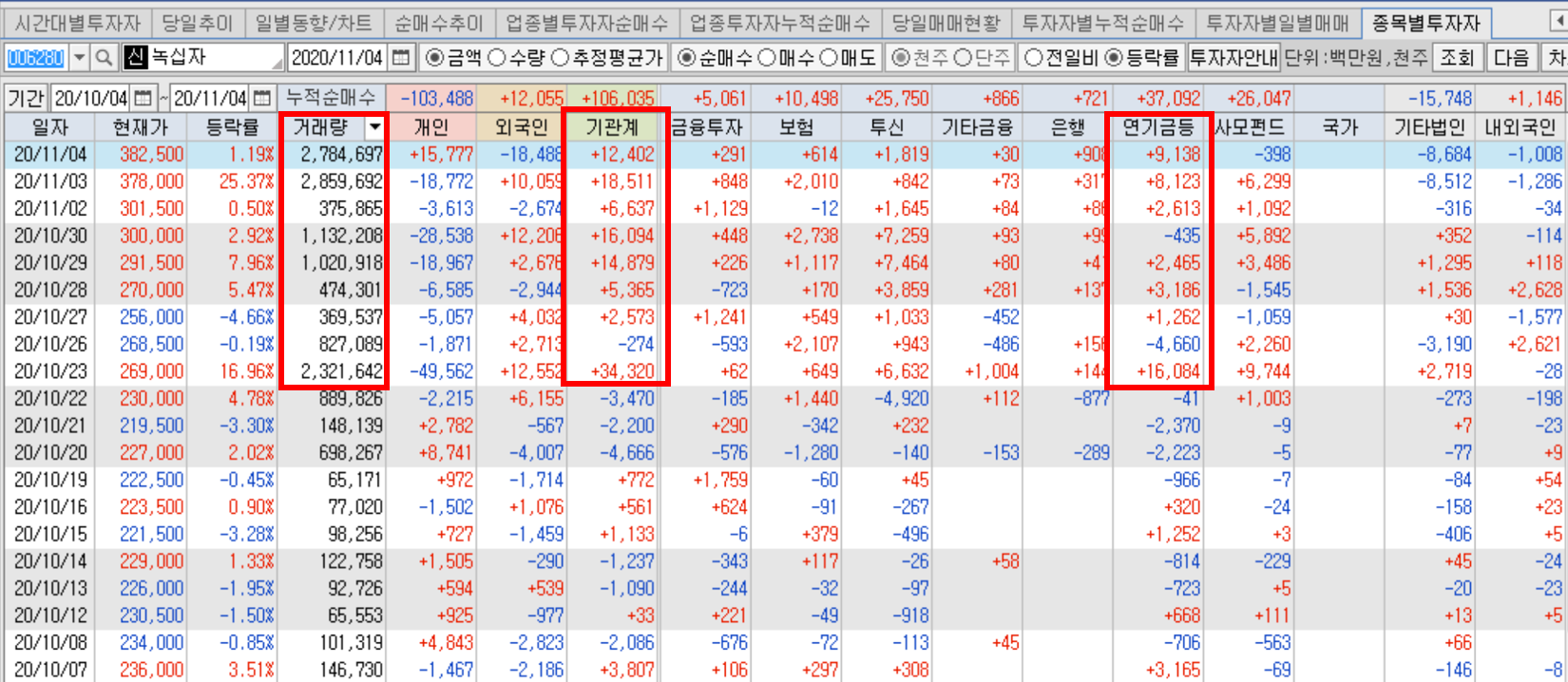 녹십자홀딩스역시 10월23일에 연기금의 베팅, 그리고 11월 3일에 베팅이 보입니다.