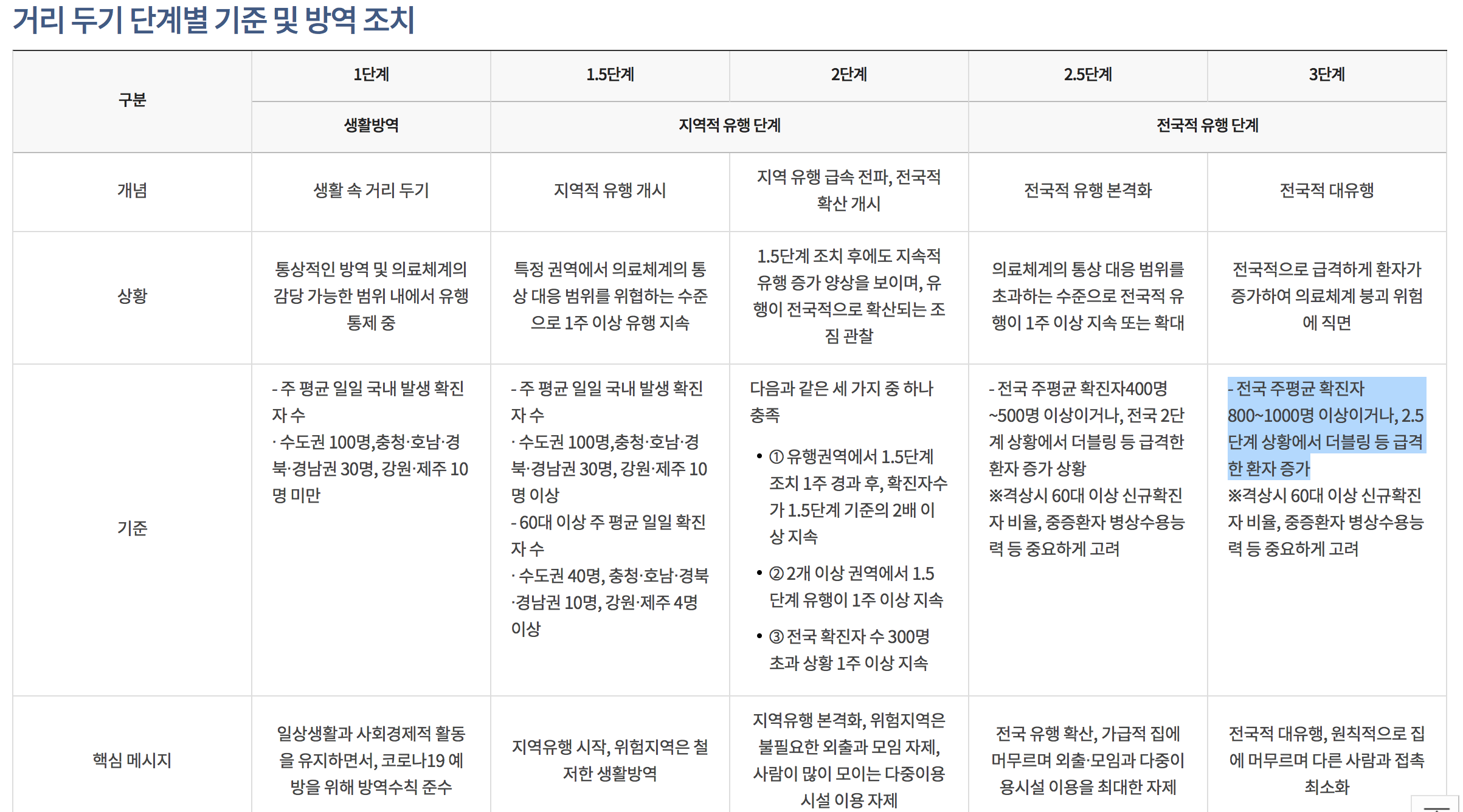 👉 사회적 거리두기 3단계의 조건은, 전국 주 평균 확진자 800~1000명 이거나, 2.5단계 상황에서 더블링등 급격한 환자 증가입니다.