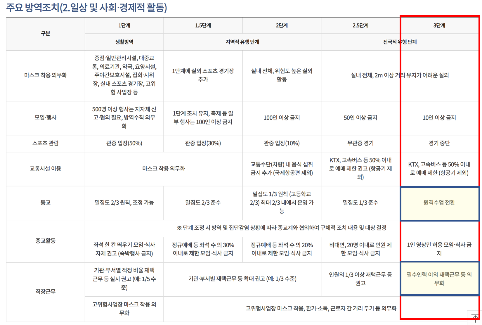 사회적거리두기 3단계에서 가장 달라지는 점은 바로, 교육과 직장근무인 주중 일상생활에 큰 조치가 내려진다는 점입니다.