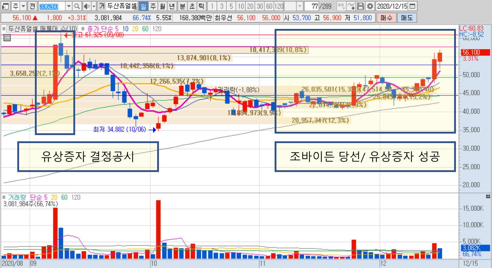 두산퓨얼셀의 차트입니다. 유상증자 공시되던 시점을 꼭지로 주가가 하락했다가,