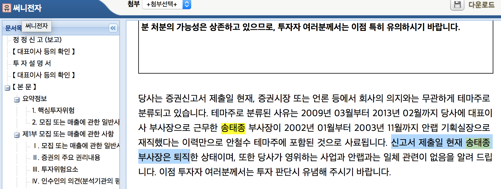 👆 써니전자에서는 테마주로 분류되었던 사실에 대해서 당사 투자설명서에도 언급하고 있고 현재 퇴임하여서 전혀 관계가 없음을 적극적으로 어필하고 있는 회사입니다. 따라서 단기 과열로 인해서 거래소 조회공시가 올 경우 적극적으로 부인할 가능성이 높습니다.