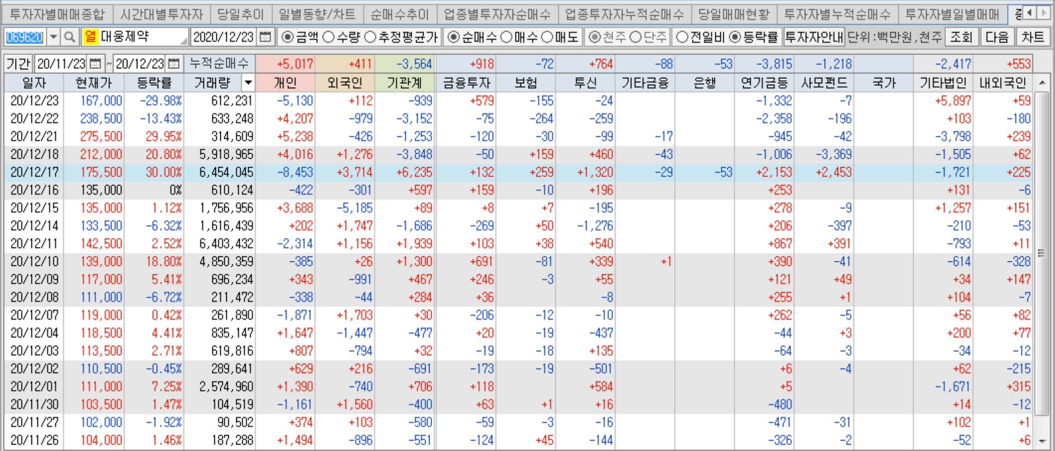 대웅의 경우 연기금이 매수를 시작한시점은 12월1일, 그리고 10일 가장많은 돈을 태웠고, 14일까지 매수세를 이어갔습니다.