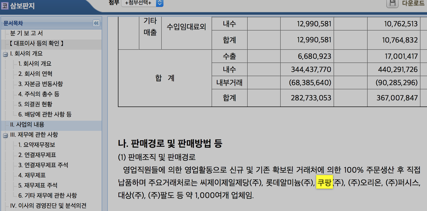 👆 삼보판지의 사업보고서에서 쿠팡을 주요거래처로 명시하고 있습니다.🔍