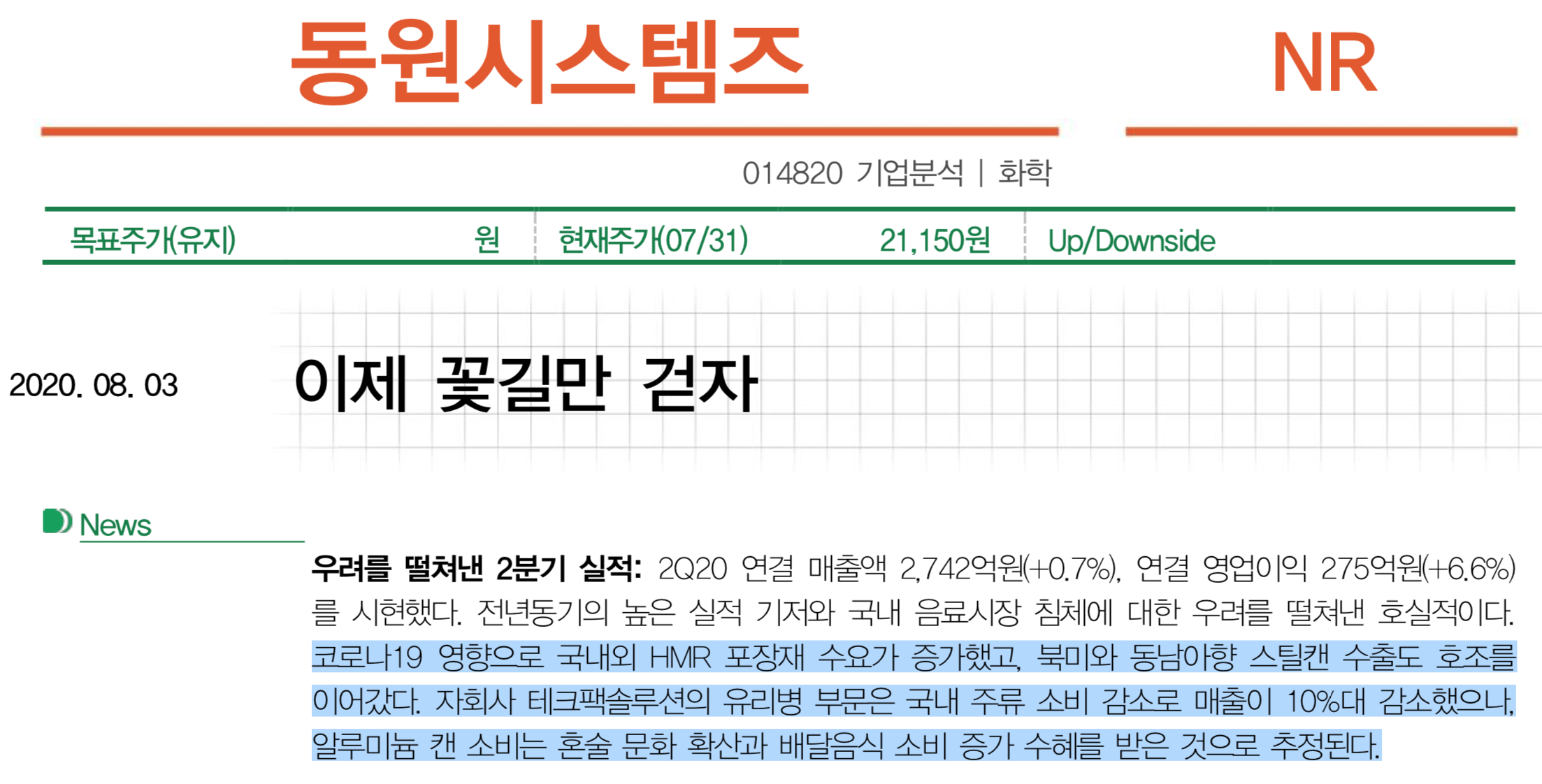 실질적으로 편의점에서 먹는 유리병때문에 생산 및 실적으로 찍히는 시점은 21년 3,4분기정도가 되지 않을까 싶네요