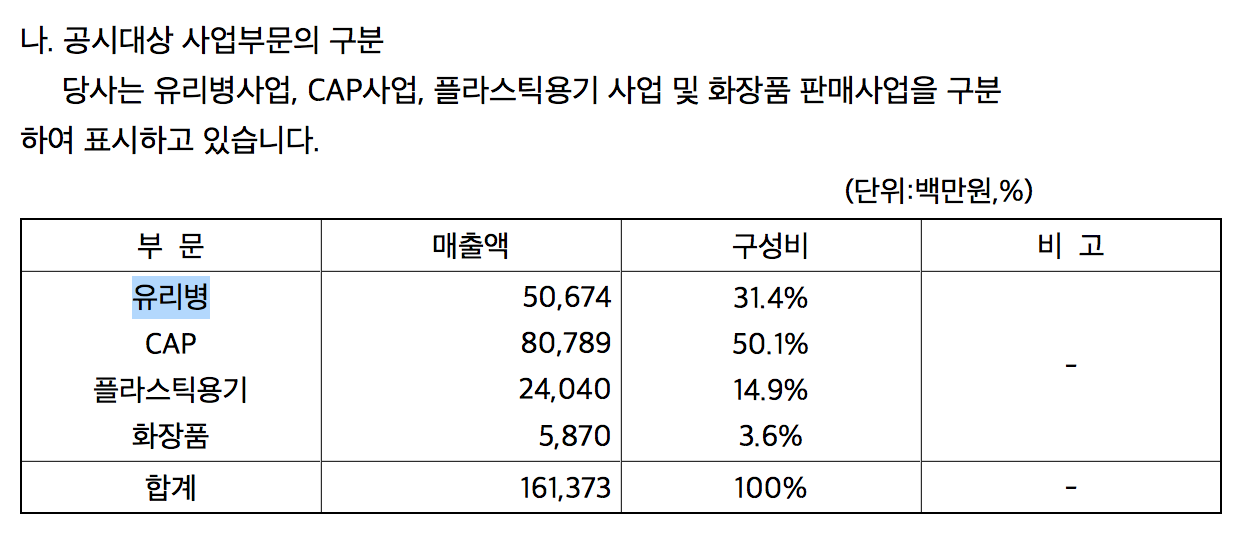 👆 동원시스템즈 역시 유리병을 만들고 있습니다. 특히 동원시스템즈는 전방사업에 해당되는 동원참치캔의 캔용기를 만드는 회사이기도 하죠 그외에도 페트병을 포함한 다양한 포장재를 만들어서 납품하는 B2B성격이 강한 회사입니다. 전방사업(식품사업)의 동향에 따라서 영향을 받겠죠?