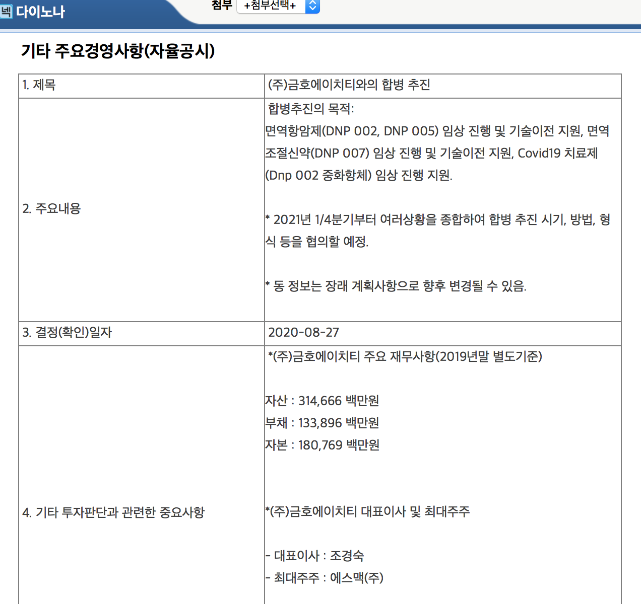 금호에이치티는 다이노나의 지분 18.74%를 보유하고있고 코넥스에 있는 다이노나와 합병을 추진하고 있습니다 (21년 1분기 예정)