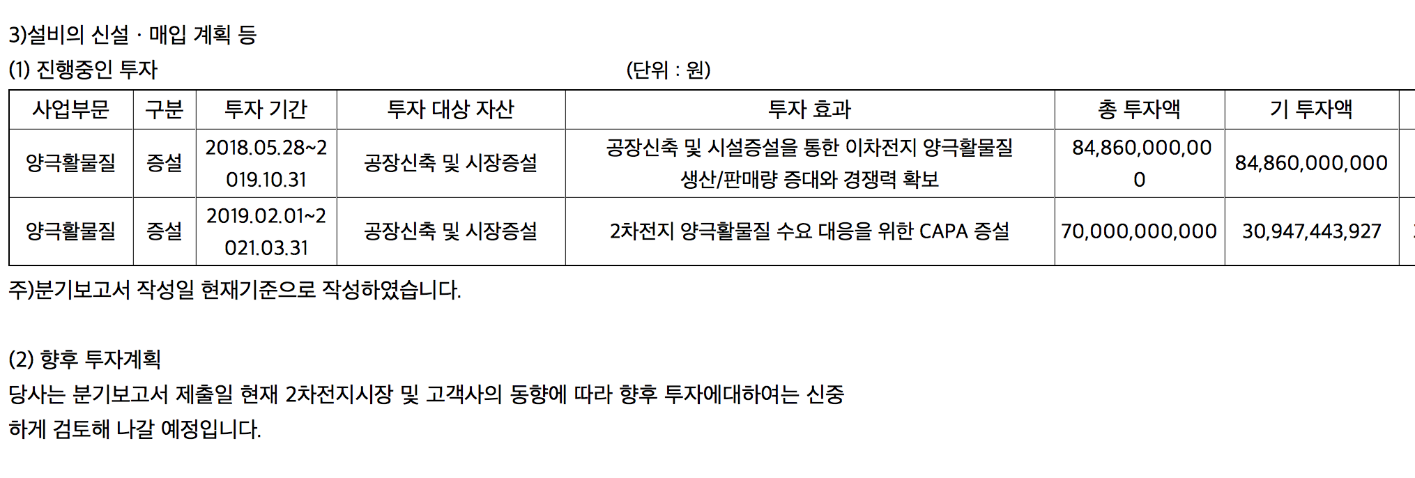 👆 엘앤에프역시 공장신축 및 증설을 계속하고 있습니다. 2021년 3월 증설을 마무리하고, 향후 증설계획이 또 나올 수 있다고 봅니다.