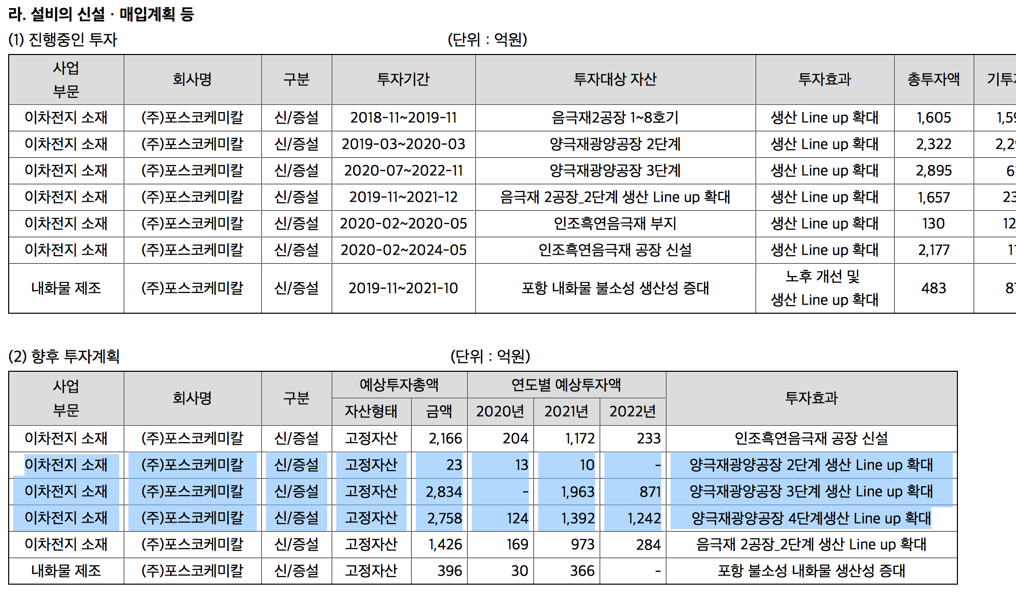 리튬을 그동안 전량 수입에 의존해왔는데, 포스코가 2017년부터 광양에 설비를 투자하여서 염수,광석,폐배터리로 부터 탄산리튬(단거리자동차, 핸드폰전지등)과 수산화리튬(장거리 자동차)을 추출하는 PosLX설비를 구축하게 됩니다. 이 설비는 2020년 3월 기준으로 광양양극재공장 2단계 투자가 완료되었고 3단계는 2022년까지 투자, 4단계투자까지도 계획하고 있습니다. 포스코케미칼은 양극재/음극재 생산설비에 공을 들이고 있고, 확장을 지속해서 나갈 계획입니다.