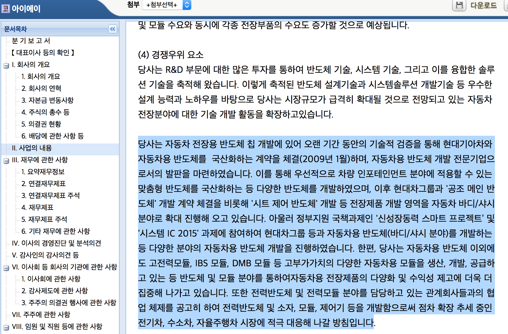 👉당사는 자동차 전장용 반도체 칩 개발에 있어 오랜 기간 동안의 기술적 검증을 통해 현대기아차와 자동차용 반도체를 국산화하는 계약을 체결(2009년 1월)하며, 자동차용 반도체 개발 전문기업으로서의 발판을 마련하였습니다. 이를 통해 우선적으로 차량 인포테인먼트 분야에 적용할 수 있는 맞춤형 반도체를 국산화하는 등 다양한 반도체를 개발하였으며, 이후 현대차그룹과 '공조 메인 반도체' 개발 계약 체결을 비롯해 '시트 제어 반도체' 개발 등 전장제품 개발 영역을 자동차 바디/샤시 분야로 확대 진행해 오고 있습니다. 아울러 정부지원 국책과제인 '신성장동력 스마트 프로젝트’ 및 '시스템 IC 2015' 과제에 참여하여 현대차그룹 등과 자동차용 반도체(바디/샤시 분야)를 개발하는 등 다양한 분야의 자동차용 반도체 개발을 진행하였습니다. 한편, 당사는 자동차용 반도체 이외에도 고전력모듈, IBS 모듈, DMB 모듈 등 고부가가치의 다양한 자동차용 모듈을 생산, 개발, 공급하고 있는 등 반도체 및 모듈 분야를 통하여자동차용 전장제품의 다양화 및 수익성 제고에 더욱 더 집중해 나가고 있습니다. 또한 전력반도체 및 전력모듈 분야를 담당하고 있는 관계회사들과의 협업 체제를 공고히 하여 전력반도체 및 소자, 모듈, 제어기 등을 개발함으로써 점차 확장 추세 중인 전기차, 수소차, 자율주행차 시장에 적극 대응해 나갈 방침입니다