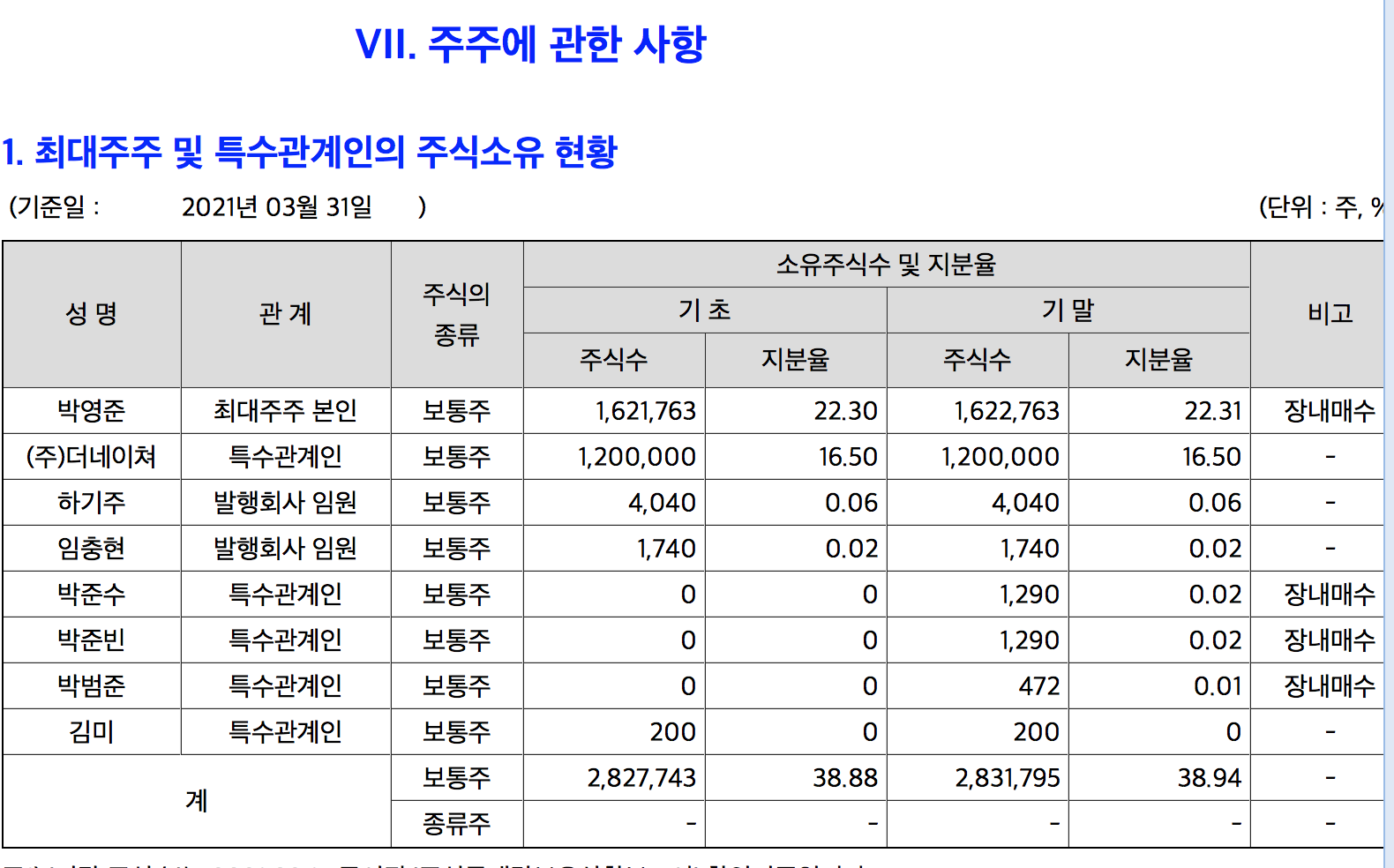 임원을 포함한 더네이쳐홀딩스 특수관계자의 주식수는 2,831,795주 (유통주식수의 38.9%)입니다.