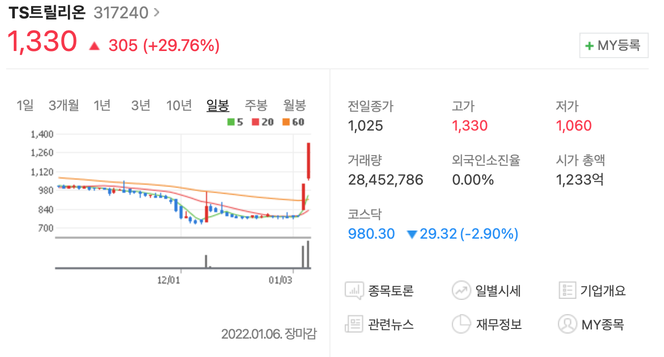 TS트릴리온은 금일 거래대금 340억 전후에서 상한가를 10분만에 바로 닫아버렸습니다.