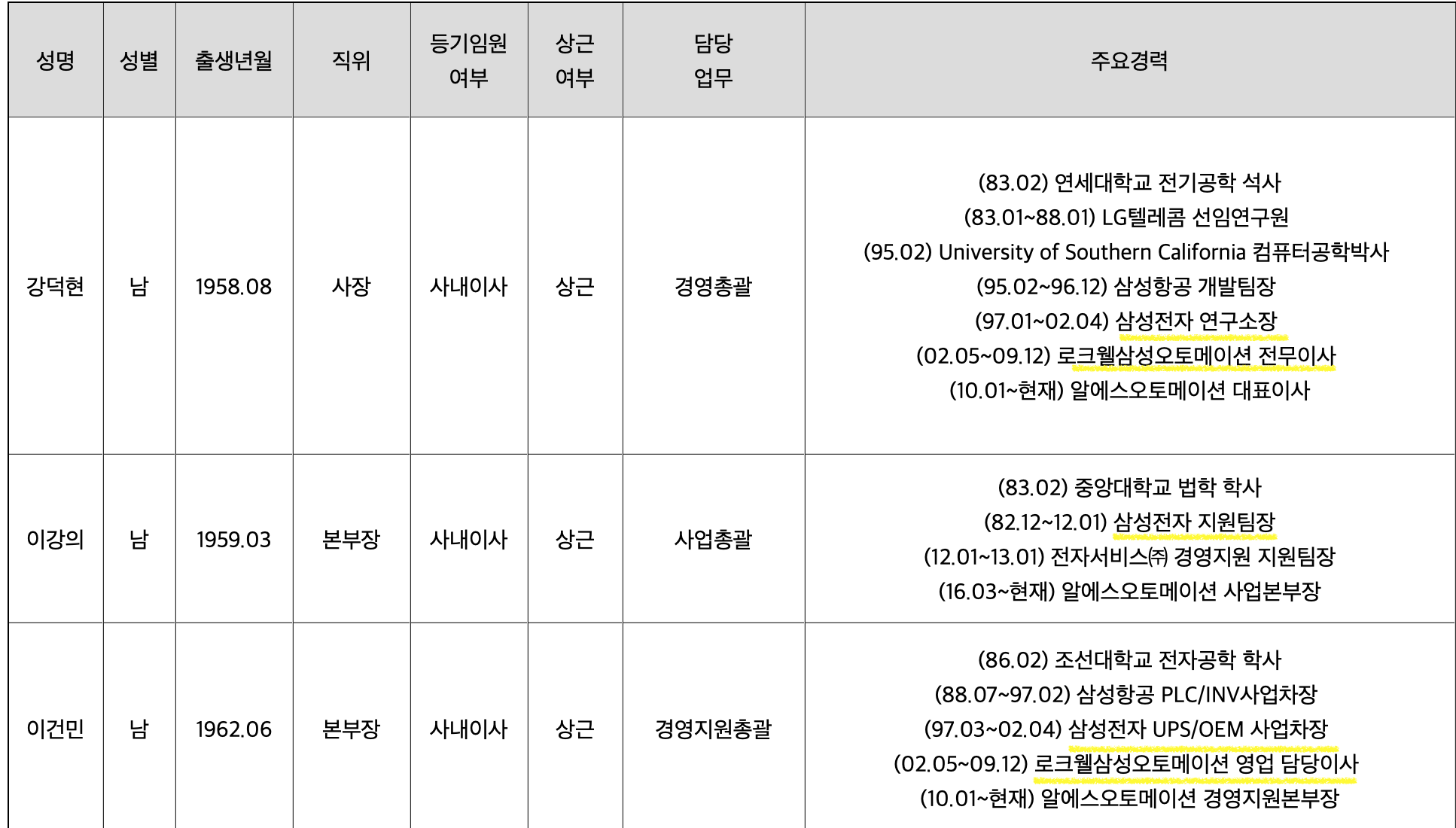 👆 대표이사와 본부장라인 모두 삼성전자 출신으로, 로크웰삼성오토메이션에서 주요직책을 역임한이후