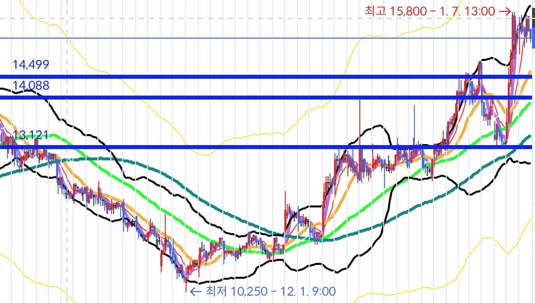 관련주의 시세가 강력하게 나왔습니다. 12월부터 1월초까지 관련주의 시세가 대단했고, 주도섹터의 역할을 확실하게 해왔습니다.